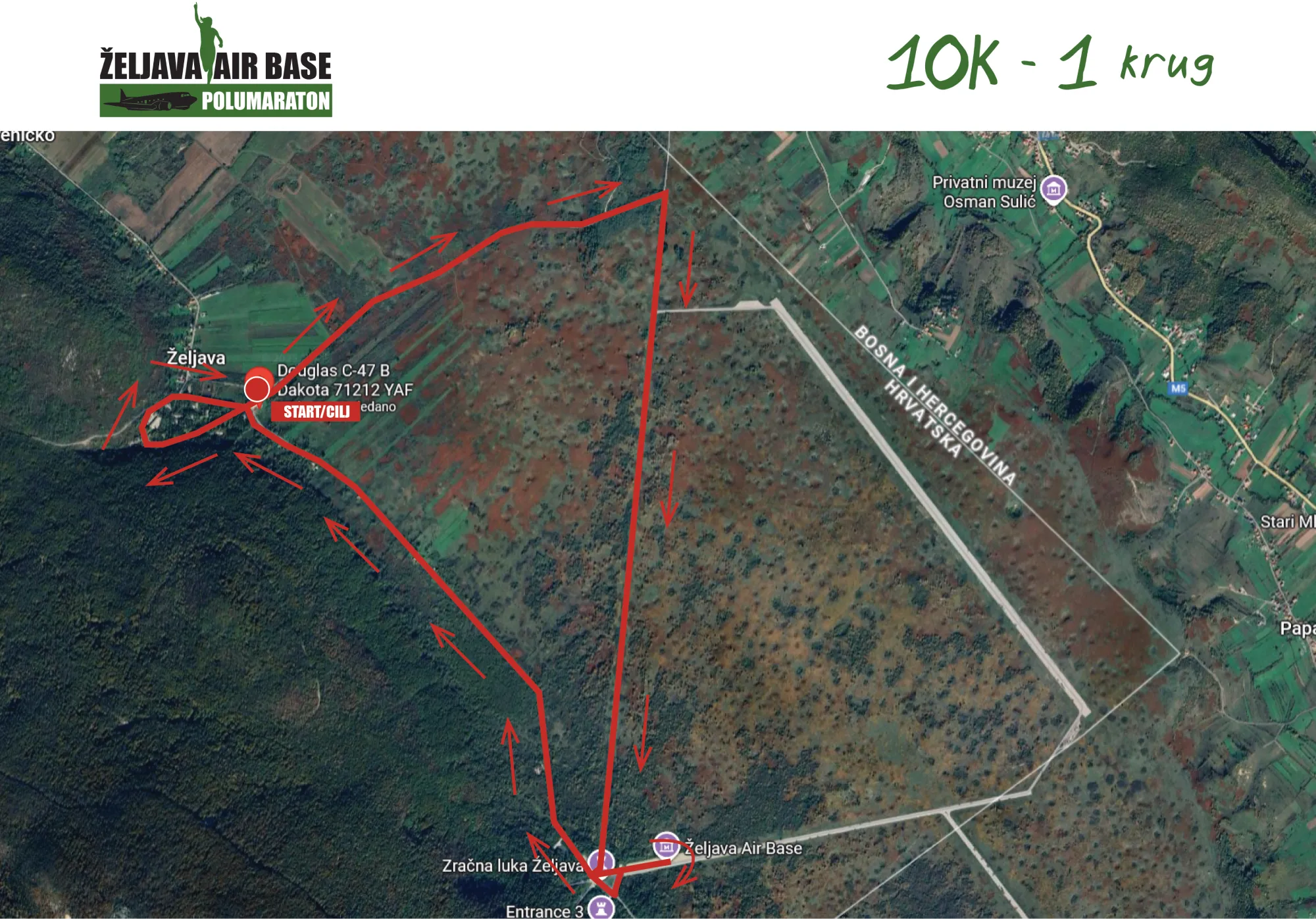 Trasa vodi po ravnoj i brzoj pisti napuštenog vojnog aerodroma Željava, idealnoj za trkače koji žele testirati svoju brzinu i uživati u trčanju bez velikih uspona.